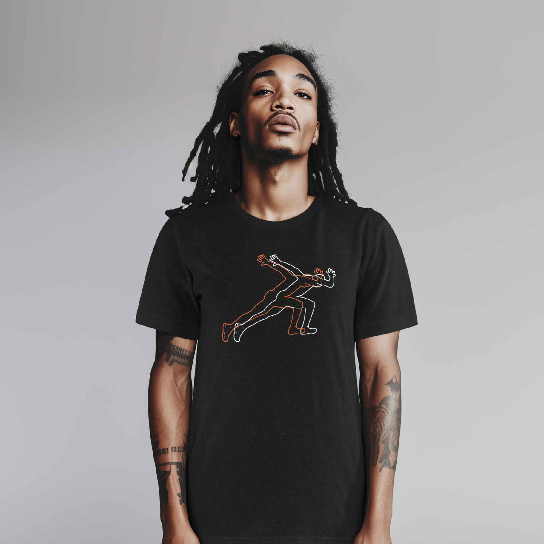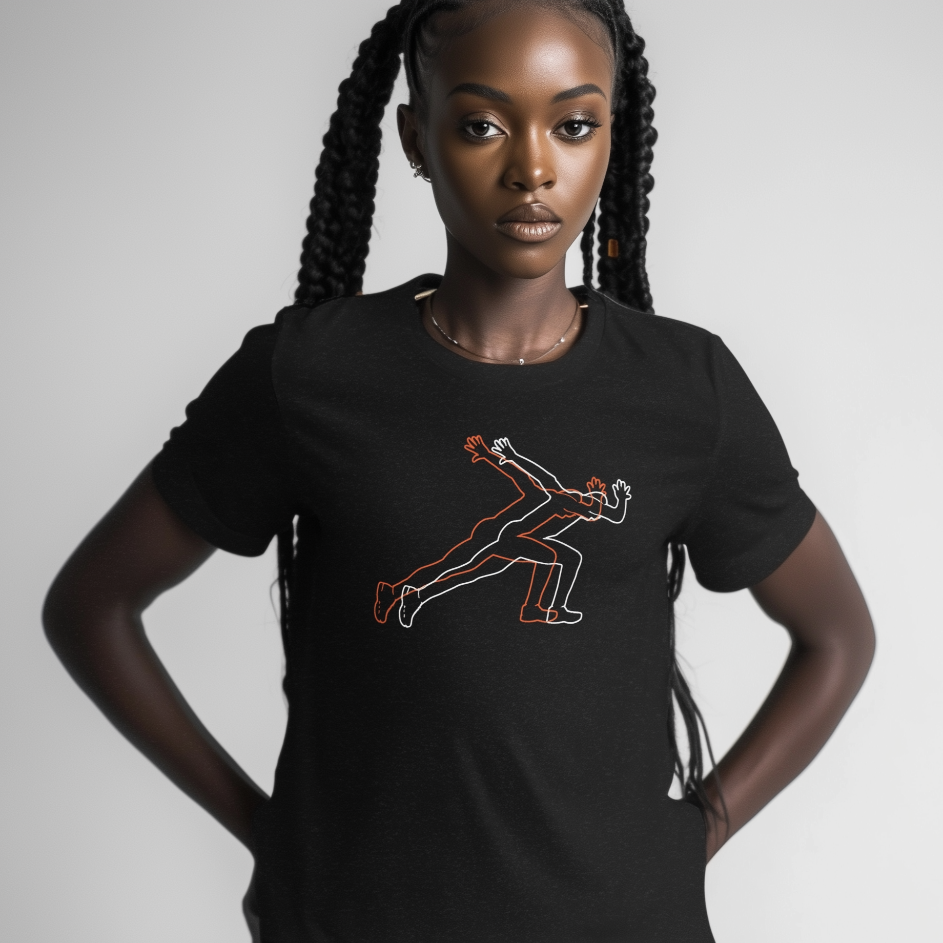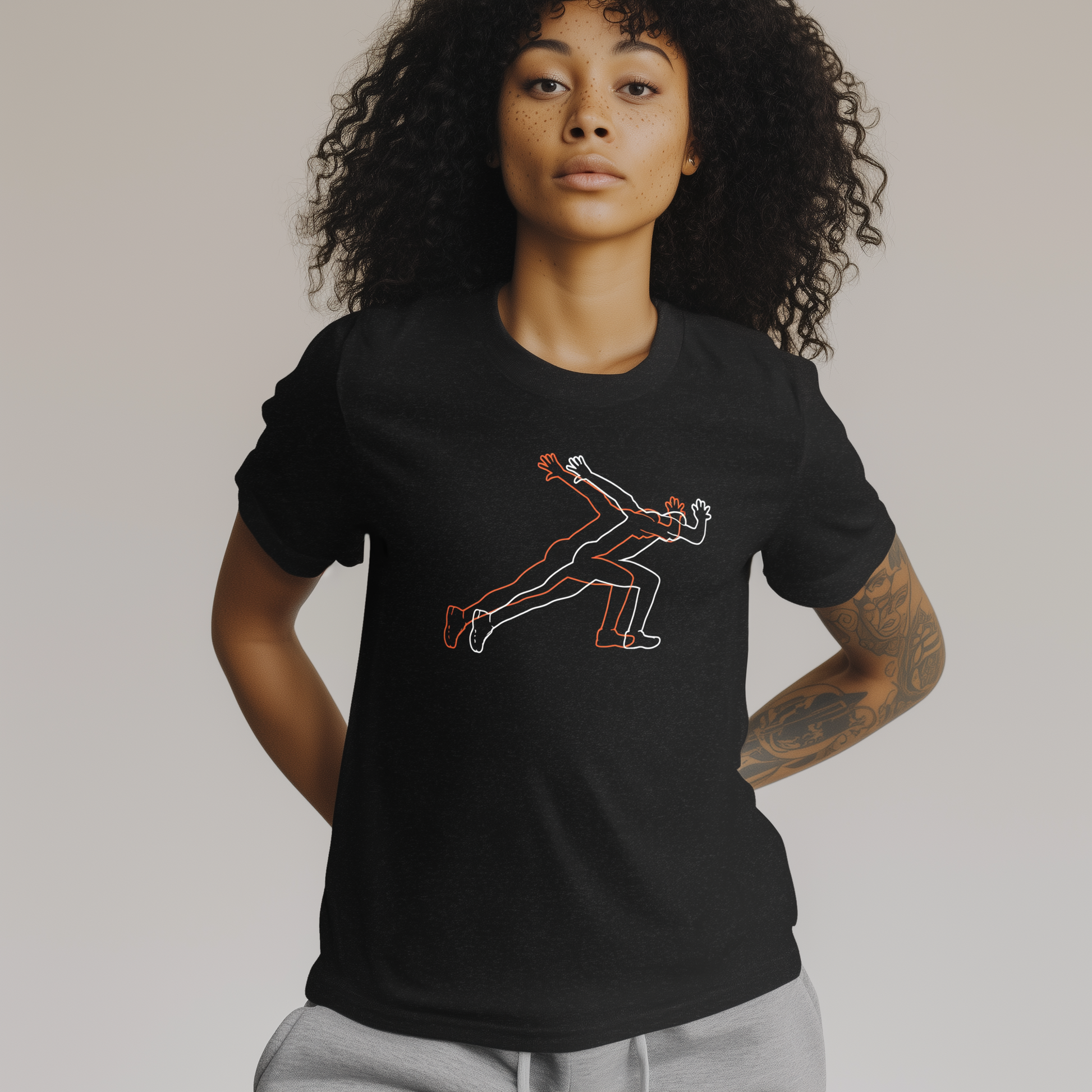 Show your inner competitor with this minimal T-shirt featuring a powerful graphic outline of two sprinters locked in battle. It’s more than apparel—it’s a tribute to the relentless and fearless pursuit of speed. Everyone that steps on the track to compete is a warrior.